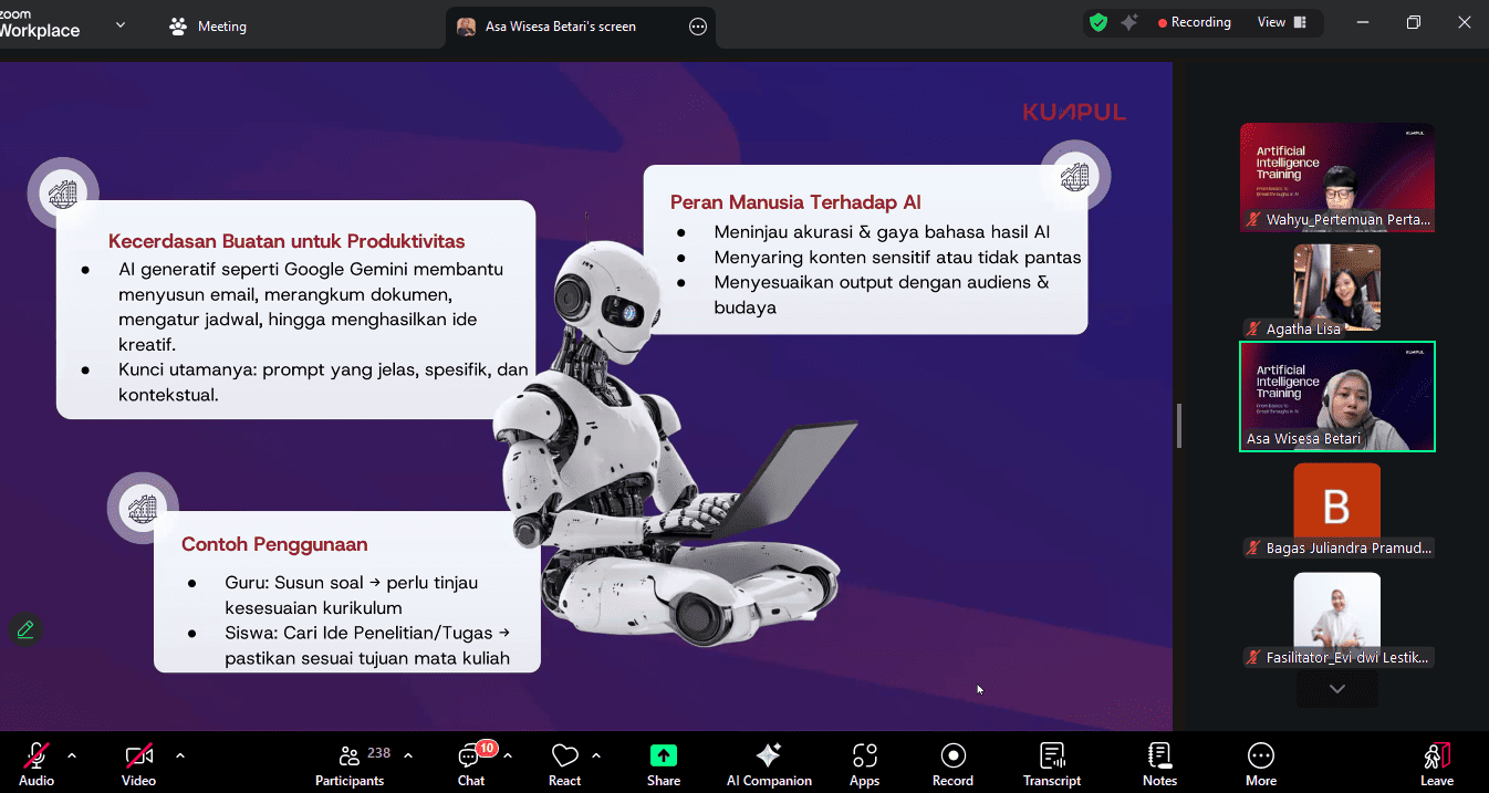 Sepanjang pelatihan, peserta menunjukkan antusiasme tinggi. Materi yang disampaikan oleh Asa Wisesa Betari tidak hanya bersifat teoretis, tetapi juga aplikatif. Peserta memilih skenario, mempraktikkan penggunaan kecerdasan artifisial, dan mempresentasikan hasilnya dalam format kelompok, berpasangan, maupun individu. Melalui kegiatan ini, peserta dilatih untuk berpikir kritis dan kreatif dalam menulis prompt sehingga mampu menyelesaikan tugas dengan baik. Selain itu, sesi pelatihan juga diselingi beberapa ice breaking yang membuat suasana belajar lebih hidup dan menyenangkan.